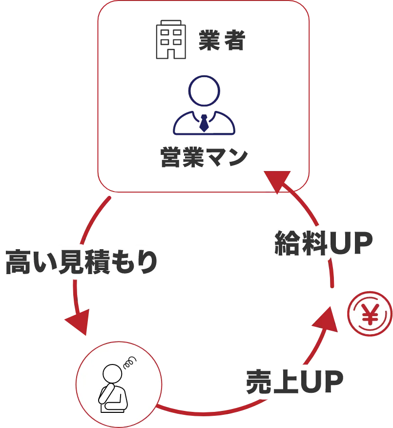 全国的に展開している白蟻(シロアリ)業者は、営業マンを抱えており、歩合制のところがほとんどです。つまり、高く売り上げれば、売り上げた分、給料に反映されます。だから高く見積もっても契約がとれそうなお客様には、高い見積もりを提示するのです。